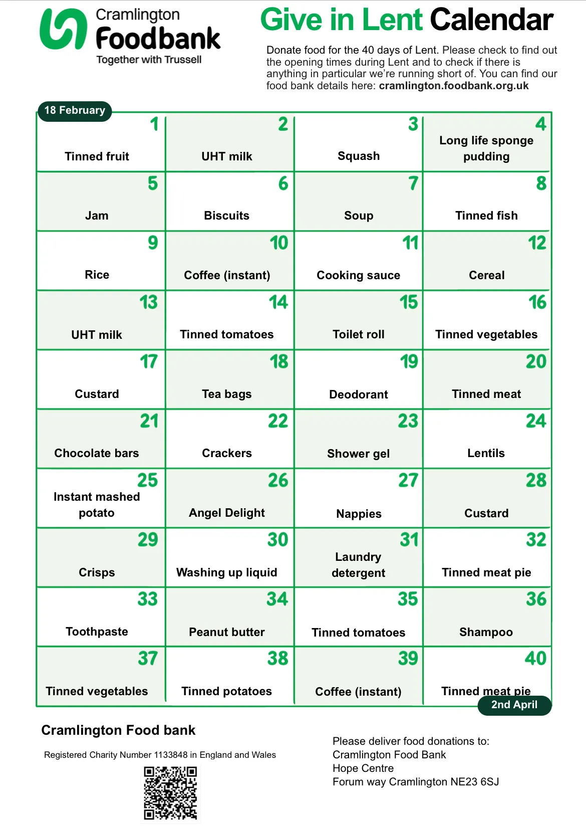Each day highlights a specific food or household item that Cramlington Foodbank is particularly in need of. Small, regular donations really do add up and help us meet demand throughout Lent.